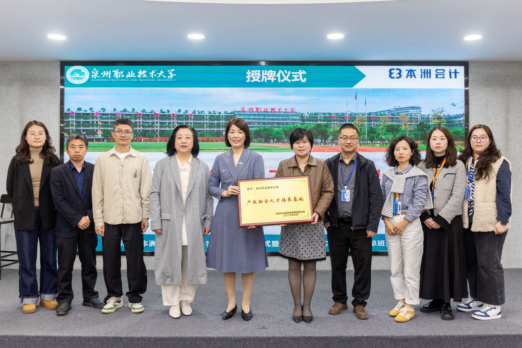 3月26日,泉州职业技术大学商学院与泉州市本洲财务咨询有限公司校企合作实训基地启动仪式暨“智能财税实战精英”订单班开班仪式,在我校隆重举行。活动以产教深度融合为路径,聚焦智能财税人才培养,为区域经济数字化转型注入新动能。出席活动的有本洲会计总经理颜美金、人才发展中心总监杨济维、共享中心总监刘恩雅、共享中心培训主管(讲师)庄莹莹、共享中心组长李锶淇等,我校校长助理/教务处处长苏康敏、商学院院长姚宏伟...