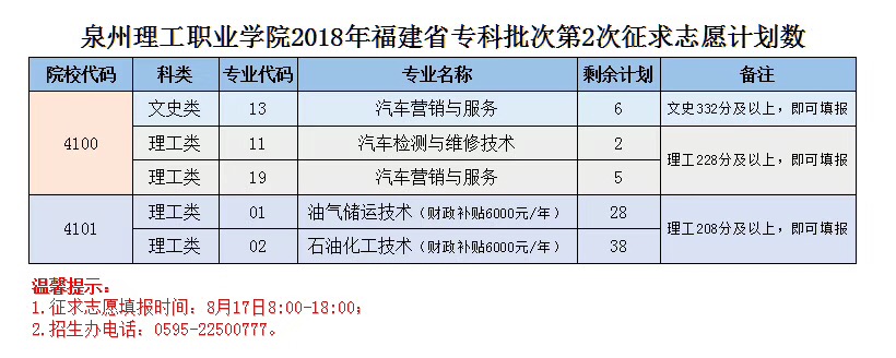 • 【福建省征求计划】泉州理工学院第1次征求志愿计划 院校代码:4100/4101