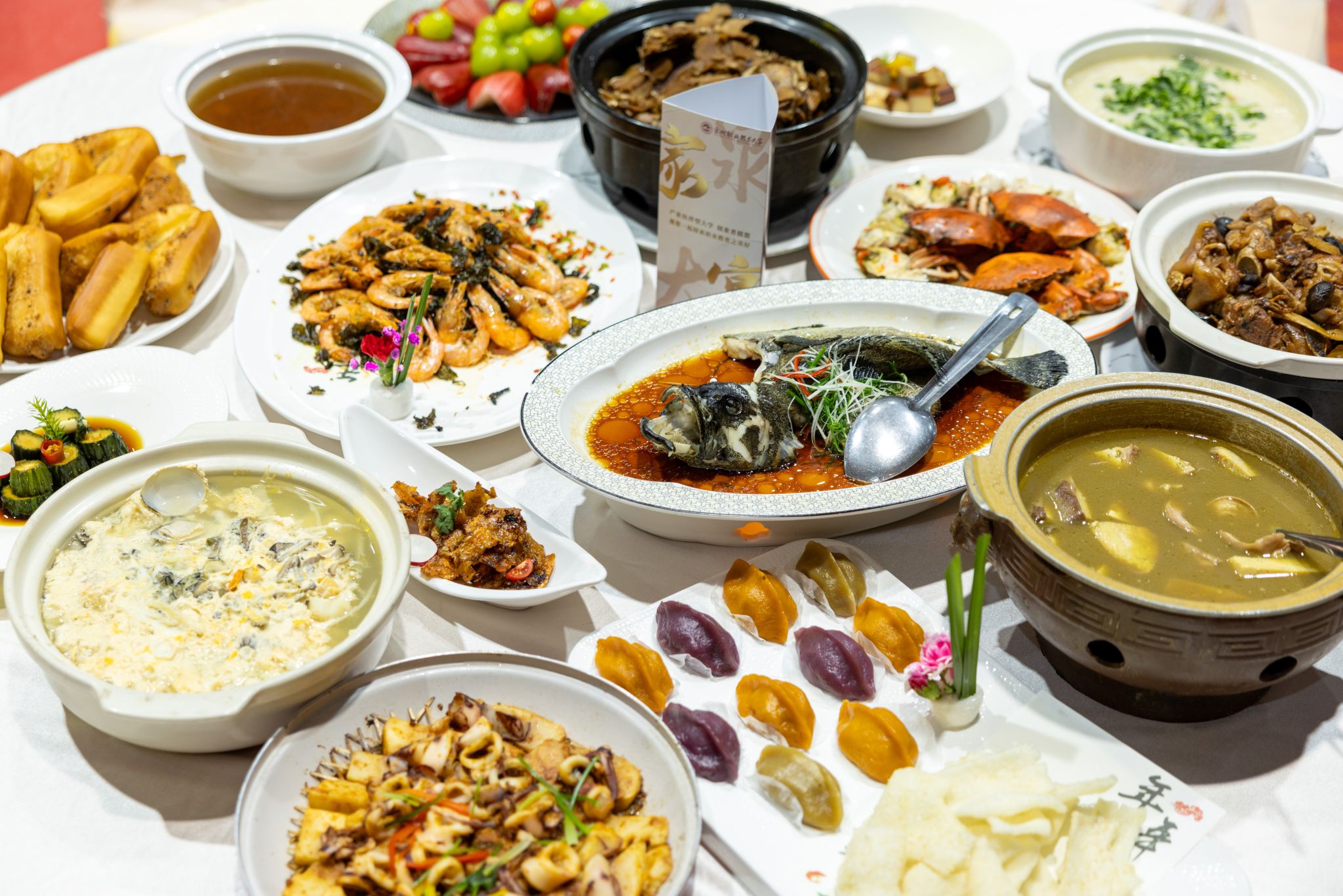 1月20日,在泉州职业技术大学的新春家宴上,泉大·海丝美食研发创新中心结合泉州各县(市、区)的特色美食,特别为家人们推出泉州风味、融入职教元素与闽南精神的菜肴。这桌宴席的十一道菜,藏着泉州的山海与精神。安溪的铁观音,焗出了“五金飘香”的明虾;石狮的红蟳与芋圆,诉说着“丹心授甲”的赤诚;从晋江古法姜母鸭的“春江水暖”,到洛江陈桥豆腐控的“匠心入魂”;从寓意“职教出海”的丰泽东海蒸石斑,到象征“国寿双...