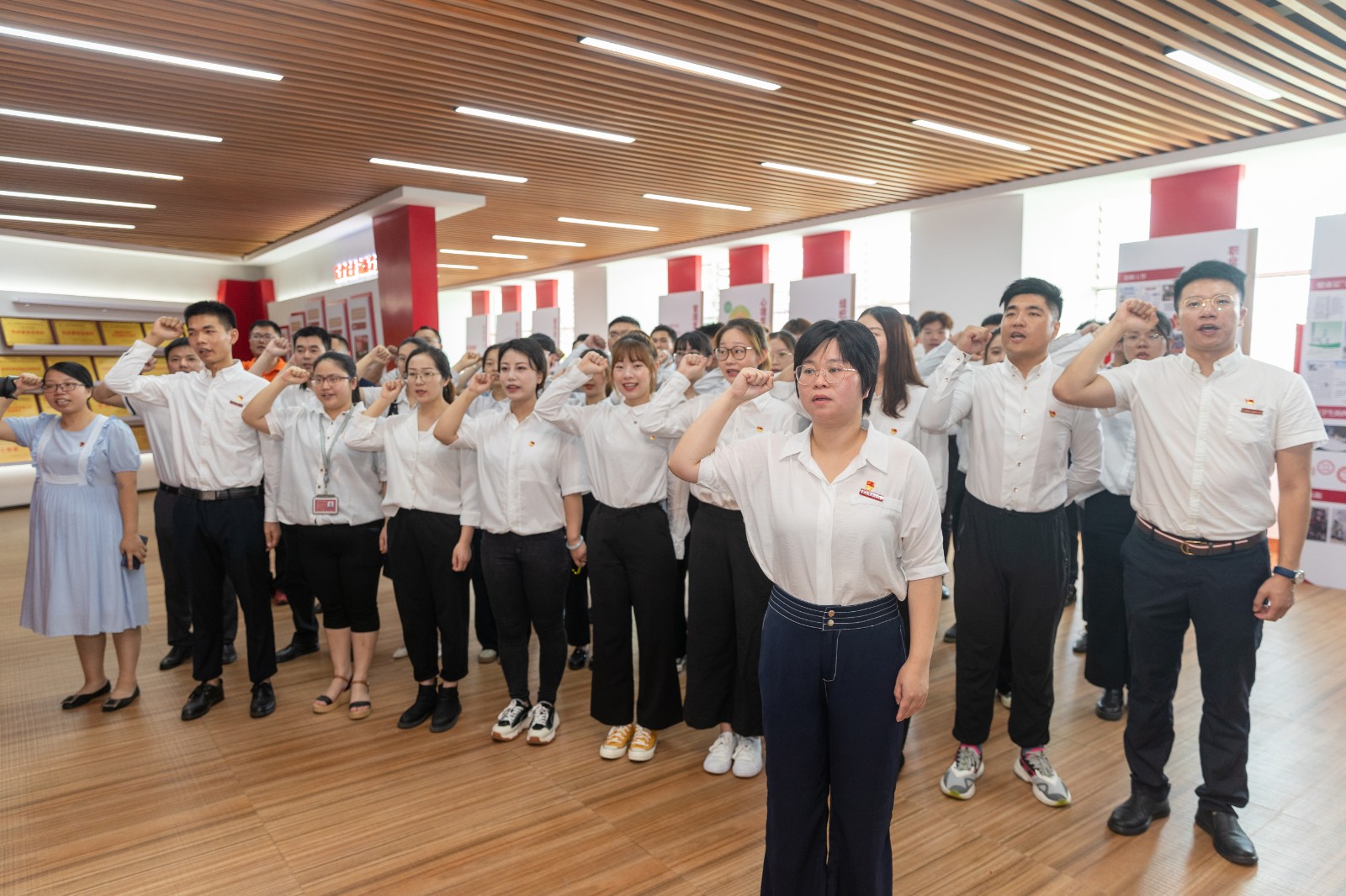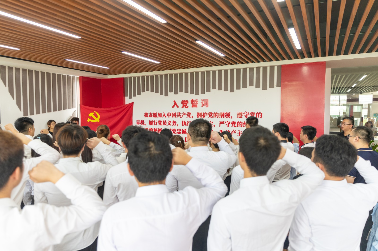 在党委组织部部长苏康敏同志的带领下,全体党员面向鲜红的党旗,举起右手,紧握拳头,庄严宣誓,铿锵有力的宣誓声在党建馆久久回荡。