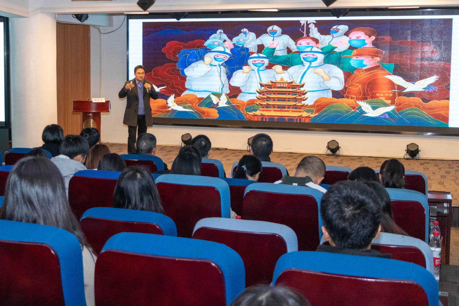 许连才老师通过“哪有什么岁月静好,不过是有人替你负重前行!”引出了全国抗疫的主题,用一个个鲜活的案例,一组组真实数据为我们展示了党和国家在抗击疫情时所彰显的中国共产党的坚强领导、中国特色社会主义制度的显著优势以及中国人民坚韧奉献、守望相助的民族精神。同时将习近平总书记所说“人的一生只有一次青春,现在,青春是用来奋斗的,将来,青春是用来回忆的”这段话鼓舞现场的师生们,鼓励大家要用我们的青春奋斗来担当起民族复兴的历史使命和时代责任,在大写的青春里谱写大写的青春梦想,用硬核的专业本领来回应时代的挑战,担当时代的使命。