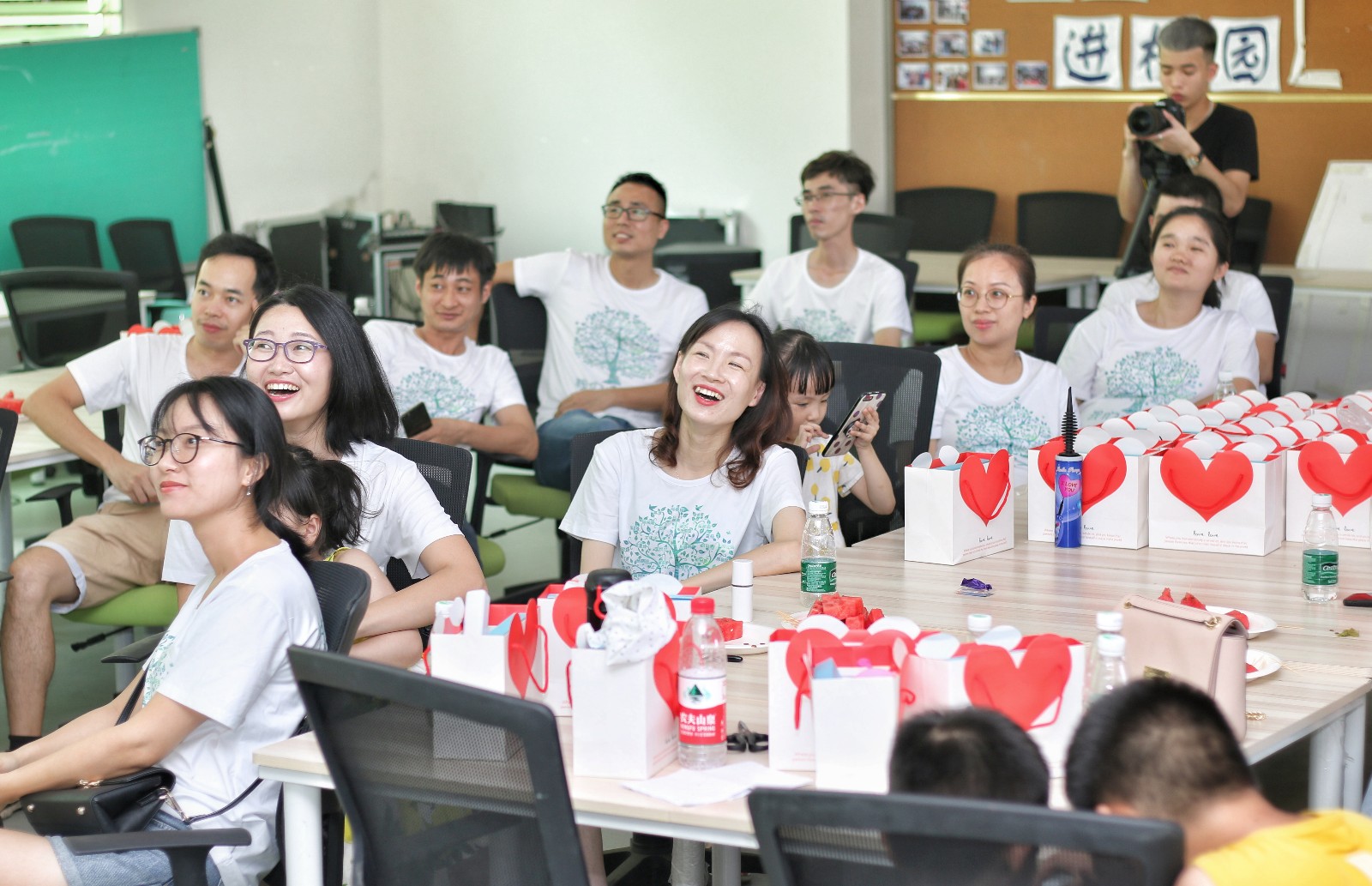 一起围着一个蛋糕大笑。”