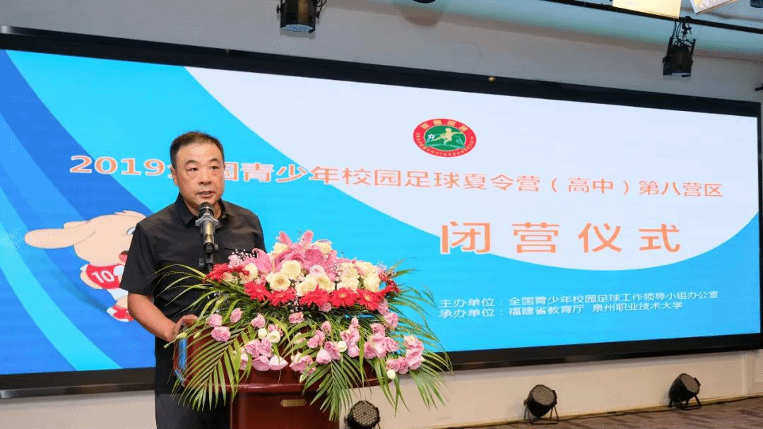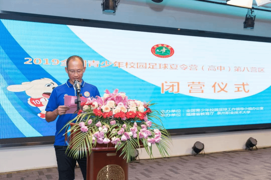 7月27日,由全国青少年校园足球工作领导小组办公室主办,福建省教育厅、泉州职业技术大学承办的2019年全国青少年校园足球夏令营第八营区(高中组)活动顺利闭营。来自福建、江西、广东、海南的16支球队及参加本次夏令营的国内外专家、各参营代表队领队、教练员、裁判员、志愿者和工作人员参加了闭营仪式。