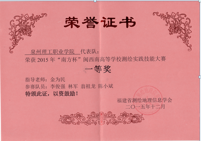 指导学生参加“南方杯”闽西南高等学校测绘实践技能大赛荣获一等奖1项,三等奖2项。