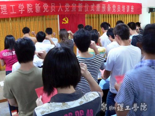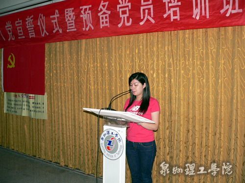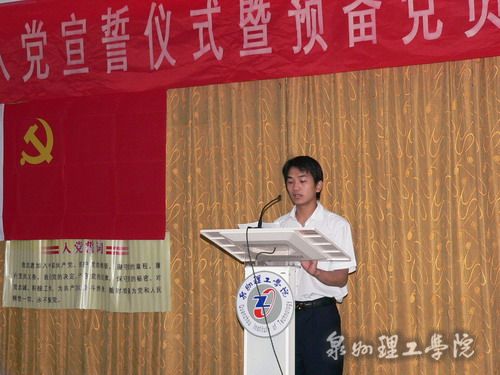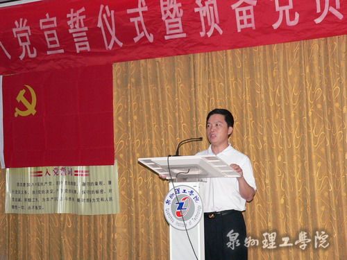 大会由校党政办刘兆麟主任主持。大会开始时,全体起立,奏《国际歌》。刘主任宣布了参加宣誓的新党员名单。我志愿加入中国共产党……”在吴滨如同志的领誓下,全体新党员面对鲜红的党旗立下庄严誓言。王莉莉、黄志兴分别代表教师和学生新党员发言表决心。