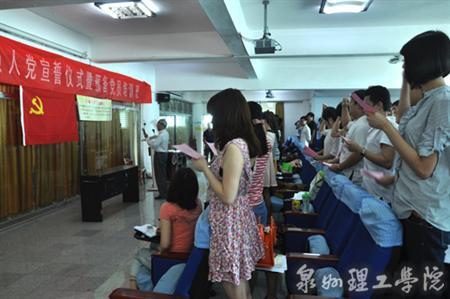 “我志愿加入中国共产党,拥护党的纲领、遵守党的章程,履行党员义务,执行党的决定,严守党的纪律,保守党的秘密,对党忠诚,积极工作,为共产主义奋斗终身,随时为党和人民牺牲一切,永不叛党”,6月9日上午九点,饱含激情的宣誓声在我校思恩楼3A报告厅响起,我校2012年新党员入党宣誓仪式隆重举行。校党委副书记黄志梅、党政办主任刘兆麟、党政办副主任陈荣惠、各系党支部书记及全校120名新一批师生党员参与此次宣誓仪式。