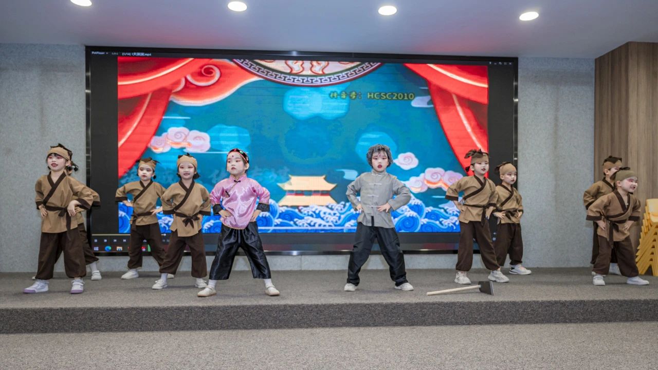 “天乌乌/欲落雨/阿公啊拿锄头/欲掘芋……”演出开始时,由中班、大班小朋友合作共同带来闽南童谣舞蹈《天黑黑》。伴随着音乐声响起,只见,孩子们穿戴着褐色的古装服饰,一会学着童谣里的老公公比划锄地的动作,一会又模仿老公公抓泥鳅的场景,表演得生动又俏皮。
