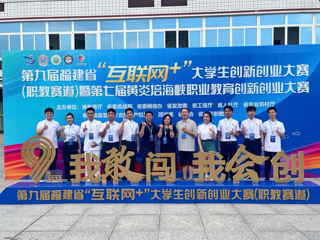 ▲ 邱宁博(左一)参加第九届福建省“互联网+”大学生创新创业大赛(职教赛道)暨第七届黄炎培海峡职业教育创新创业大赛,并获铜奖