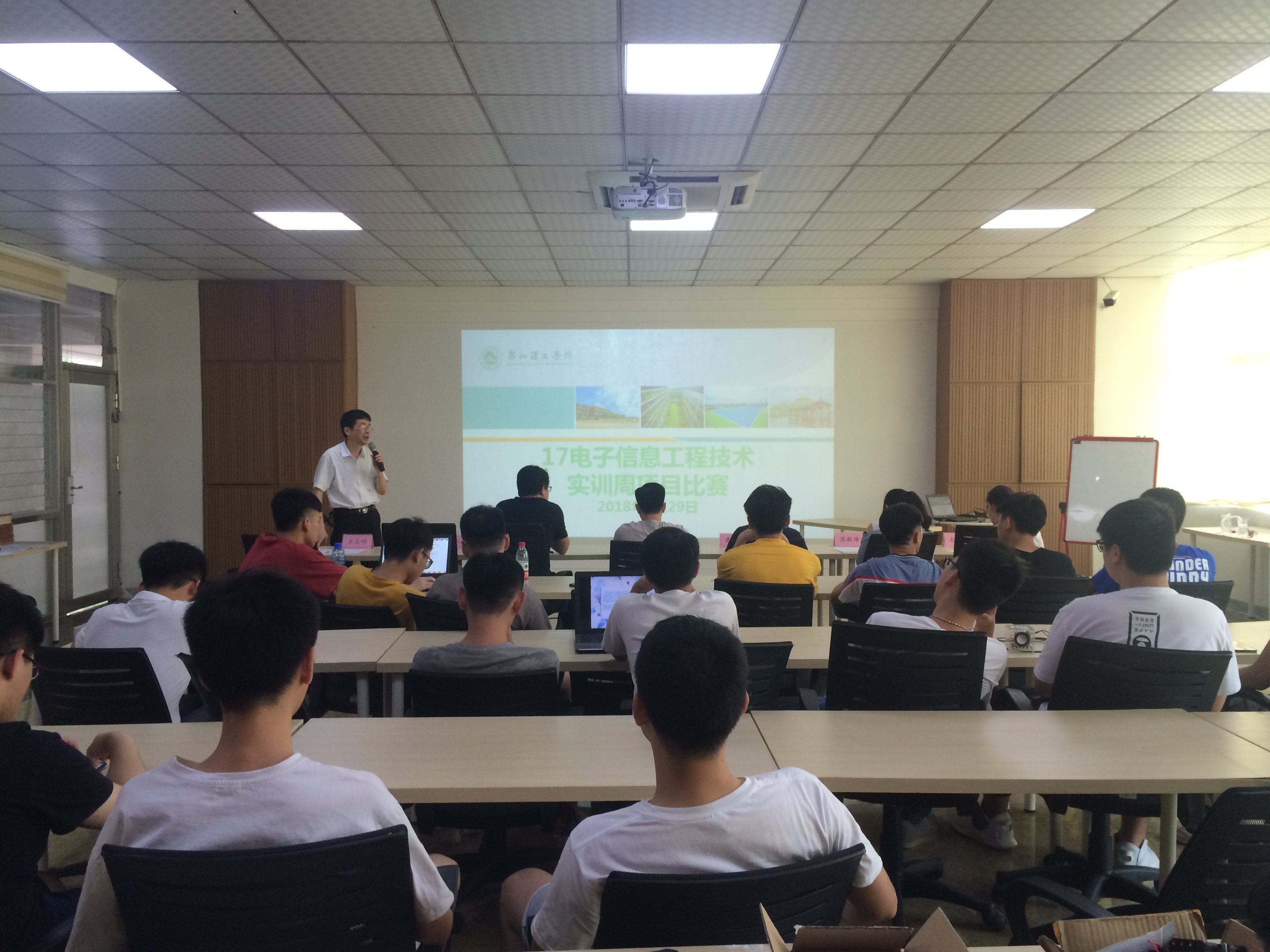 629午,我系电子信息工程技术专业校主楼第二会议室举行17级电子信息实训成果汇报会。会议邀请了科研处郭霏霏老师、教务处许亿老师、工学院张水参老师,及电子信息专业王燕平老师,苏新萍辅导员等担任评委,会议由电子专业主任王志明老师主持,17级电子信息工程技术专业全体学生参加了本次活动。
