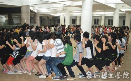 “缘来一家人”互动小游戏共分为五个环节,由链接加速、心心相印、解手链、传递呼啦圈、协力拔河等组成,学生会各部门组九队进行PK,胜者获奖,败者受惩。听完主持人的介绍,各部成员跃跃欲试,誓要夺冠,比出一番结果来。链接加速考验团队的平衡性、协作能力,心心相印考验两个人的默契,解手链考验团队的合作灵敏性,小小的呼啦圈灵巧的穿梭10人身影,偶尔笨拙的卡身,别有一番趣味。传递呼啦圈,十人紧握双手,以圆圈旋转转至终点,顿时头上一堆小星星别样闪耀。协力拔河由财经系学生会、财经系团总支学生会、财经系团总支自律会参加前方奋斗,后方支援也是热火朝天,随着“物资”的宣布,便是忙得团团转的筹集,男生以公主抱或背着迅速向终点冲去。精彩的游戏转眼便过,可同学依然热情不减,不时为部员加油鼓气。