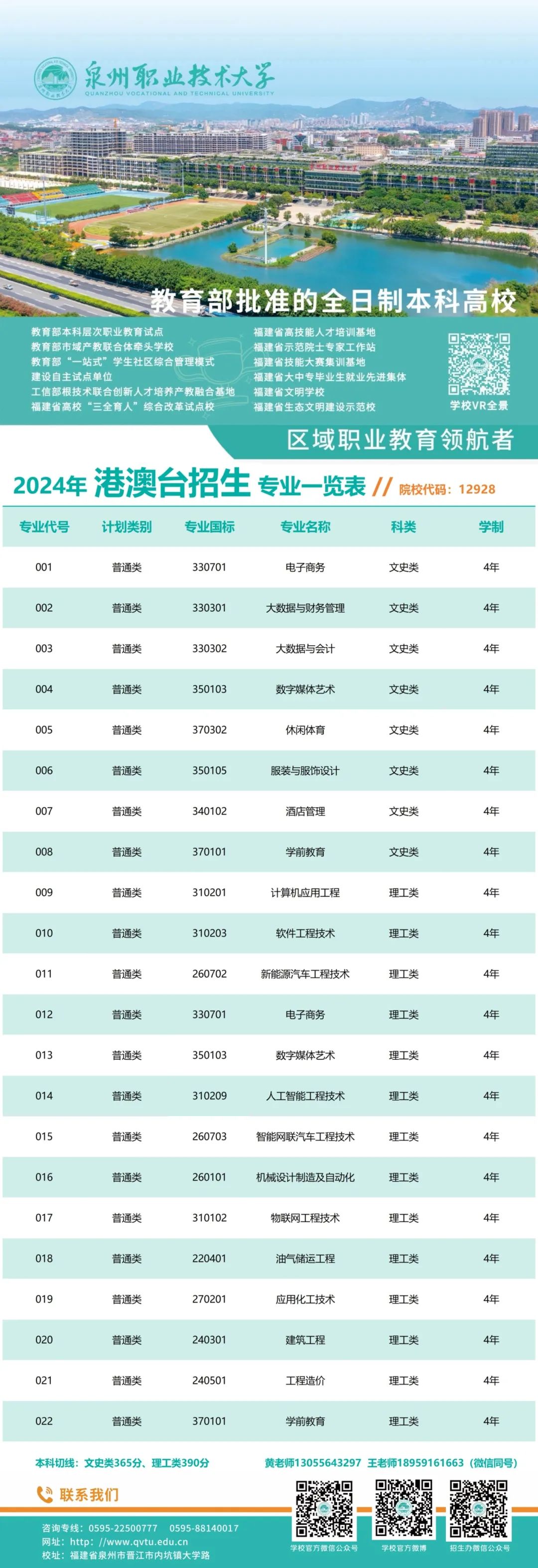 泉州职业技术大学面向全国联招共有20个本科计划,其中文史类10个、理工类10个,院校代码12928,具体专业如下: